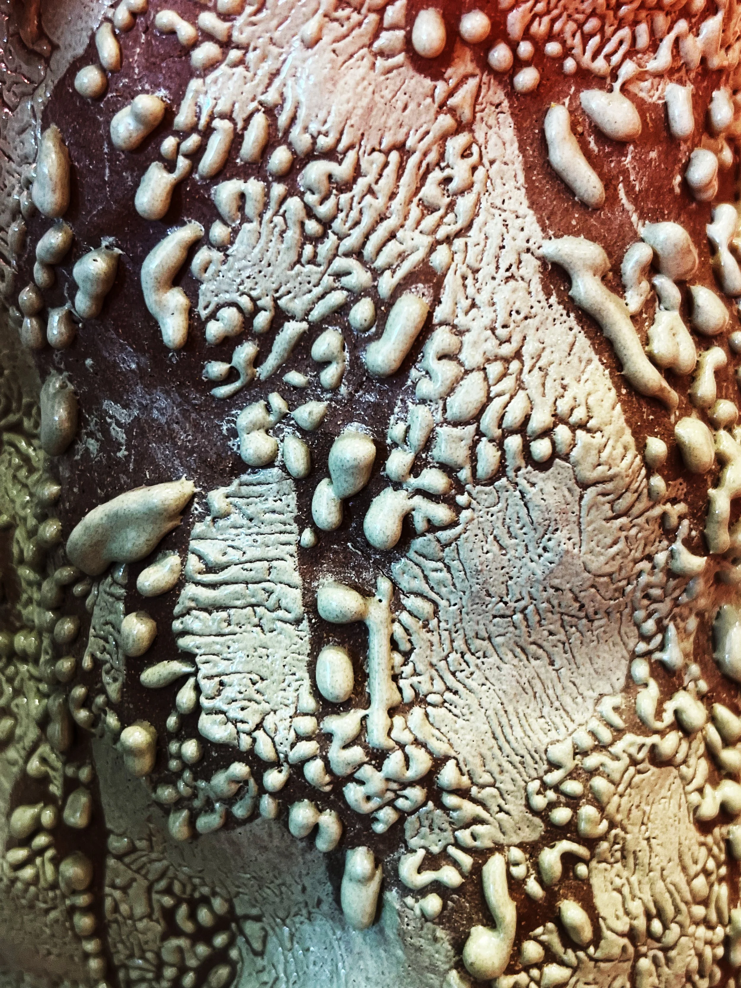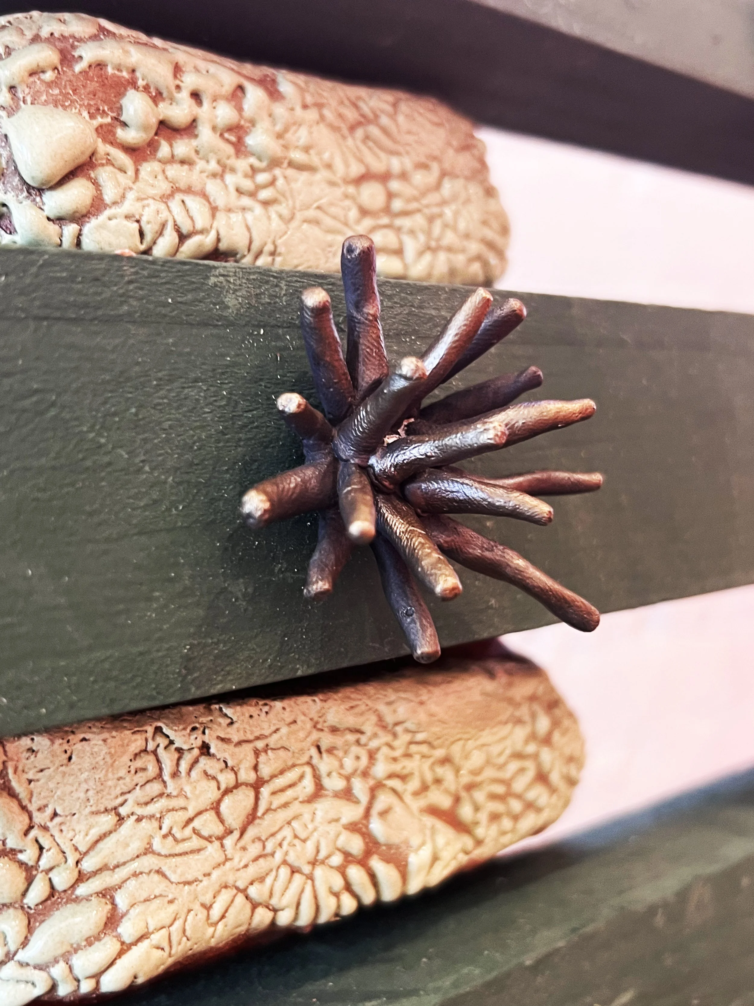 Glazed ceramic, paint, wood, etched copper, bronze.